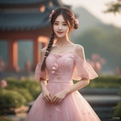 RAW photo, highest quality, (masterpiece:1.2), (High detail RAW color photo professional close-up photo), (photo realism:1.37), (highest quality), (best shadow), (best illustration), ultra high resolution, (highly detailed CG unified 8K wallpapers), physics-based rendering, 8k, UHD, anatomically correct, textured skin, ccurate, super detail,(aegyo sal), (ulzzang-6500-v1.1:0.3),1girl,solo,(full body:1.44),extremely detailed hair, Perfect face shape, Perfect mouth shape, beautiful detailed girl, smile, extremely detailed eyes and face, Perfect Fingers,(fair face:1.2),(low twintails:1.45), (Moderate breast:1.2),skinny,(Slim thighs:1.2),elegant_dress,(arms behind back:1.35),(guzhen:1.38),(depth of field:1.35),pink dress, , <lora:EMS-26581-EMS:0.6>, <lora:EMS-21302-EMS:0.4>