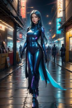 official art, unity 8k wallpaper, (ultra detailed), beautiful and aesthetic, beautiful, masterpiece, best quality, (fullbody) (1girl:1.3), (long hair, blue hair:1.4), mature female, cyberpunk, mecha, sexy, iridescent eyes, daylight, standing, (street:1.3), neon light, (wind blowing:1.3),futuristic_aodai