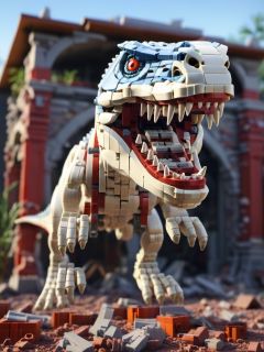 BJ_Lego bricks, T-rex, solo, open_mouth, red_eyes, teeth, blurry, no_humans, robot, sharp_teeth, building, mecha, science_fiction, monster,3D Model ,8k,intricate,highly detailed,majestic,digital photography,broken glass,(masterpiece, sidelighting, finely detailed beautiful eyes:1.2),hdr,realistic,high definition,<lora:Lego_World_SDXL:1>