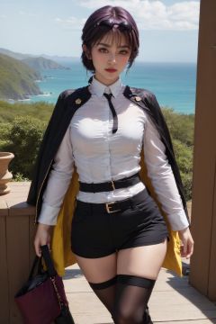 1girl, solo, long hair, breasts, looking at viewer, bangs, shirt, black hair, thighhighs, brown eyes, medium breasts, jacket, white shirt, braid, short sleeves, cowboy shot, outdoors, parted lips, shorts, collared shirt, belt, black thighhighs, blurry, arm up, lips, short shorts, blurry background, black shorts, sunglasses, eyewear on head, jacket on shoulders, shirt tucked in, kafka