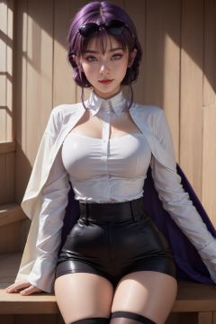 1girl, solo, looking at viewer, light smile, large breasts, purple eyes, sunglasses, upper body, eyewear on head, white shirt, black jacket, kafka,