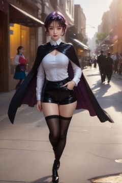 1girl, solo, looking at viewer, light smile, medium breasts, purple eyes, sunglasses, upper body, eyewear on head, white shirt, (black cape:1.3) , kafka, pantyhose, black shorts, walking on street