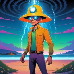 in the style of simon stalenhag, retro futurism, (masterpiece) , (best quality) , (digital painting) , wide angle, ((a cool humanoid alien:1.2)), full body, wide shot, wearing a hat adorned with blinking fairy lights, hat is illuminating his face with soft multicolored glow, entrancing effect, hypnotic, funky retro attire, jacked covered in patches of stars and galaxies, brightly colored shirt underneath, whimsical, otherworldly, on a beach, <lora:straightsyle:0.79> <lora:coloringbooksdxl1.0:0.69>