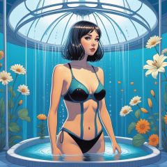 in a style of simon stalenhag, retro futuristic style, [buzimage] (masterpiece), (best quality), (ultra-detailed), (highly detailed CG illustration), ((an extremely delicate and beautiful)),(cute delicate face),cinematic light,(1girl), in swimming suit, showering, in a shower capsule, solo,full body,(in shower), ((standing)), shower head, water, expressionless, (lily plants entangling:1.35), coloring book page, ((black and white)), ((monochrome)), <lora:drawingstyle:0.88> <lora:drawingbooksdxl2:0.54>