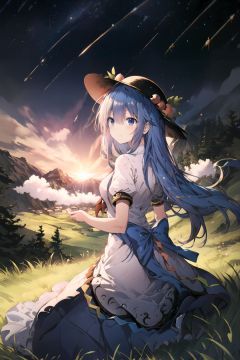 ((best quality)), ((masterpiece)), ((ultra-detailed)), (illustration), (detailed light), (an extremely delicate and beautiful),((trim)),incredibly_absurdres,(ray tracing),(glowing light),(sun),((beautiful sky)),(scenery),((mountain)),(cloud),((nature)),(grassland),((fog)),(pine),(red ross),(meteor),((forest)),(Star Trails),watercolor, hat,(long hair), Sky,hinanawi tenshi,1girl,peach,blue hair,long hair, <lora:水润RenalithV3(改):1>, <lora:修手V3:1.2>, <lora:tenshihinanawi:1>