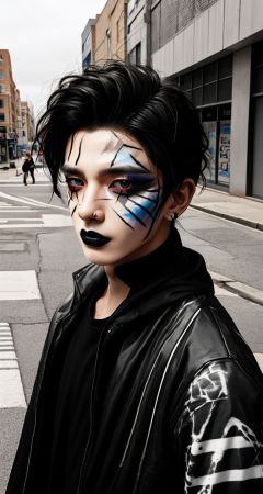 ((masterpiece)), ((best quality)), 8k, high detailed, ultra-detailed, photo,outdoor,xsfashion, 1boy, street fashion, make up,eyeshadow, face paint, tattoo, <lora:XS_fashionV2:0.7>
