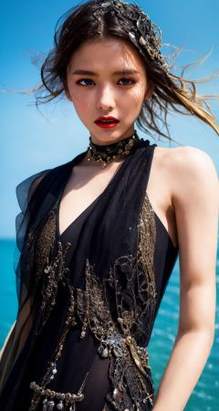 ((masterpiece)),((best quality)),8k,high detailed,ultra-detailed,Innovative fashion photography, avant-garde fashion, sea background, 1girl, fashion clothes, upper body view, face to viewer,  creative styling, rich textures in intricate detail, intense expression with emotional impact, dynamic and unconventional composition,<lora:muguang:1>,