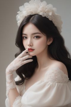 1girl,solo,.sexy pose,pensive woman,voluminous dress,intricate lace,embroidered gloves,feathered hat,curled hairdo,pale skin,minimal makeup,tender smile,dainty neckline,nostalgic atmosphere,still life,black hair,black pupil,red lips,