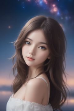 wallpaper,huge filesize,1girl,upper_body,looking_at_viewer,stars in the eyes, messy floating hair, colored inner hair, Starry sky adorns hair, depth of field,