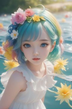 wallpaper,huge filesize,1girl,upper_body,looking_at_viewer,dynamic angle,rainbow hair,detailed cute anime face,((loli)),flower,cry,water,corrugated,flowers tire,broken glass,(broken screen),atlantis,transparent glass,