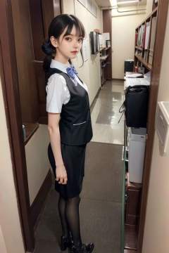 8k, 24mm, f1.8, best quality, ultra high res,(photo realistic:1.4),1girl, cute girl, Japan, black eyes, (cute face, hyper detailed face:1.3, symmetry eyes), standing, (office:2, hyper detailed background), looking at viewer,small breasts, \\(PureErosFace:0.7),clk, vest, pencil skirt, bow, <lora:clerkSuit_clk:0.6>,full body,from side, (pantyhose:1.1),