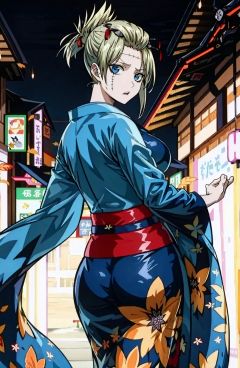 (masterpiece, top quality, best quality, official art, beautiful and aesthetic:1.2),(cowboy shot),1girl, solo,looking at viewer,short hair, blue eyes, blonde hair, japanese clothes, kimono,white background, huge breasts, scar, anger vein, scar on face, folded ponytail, spoken anger veins, tokyo landscape, outdoors,huge breasts, thighhighs, curvy, mature