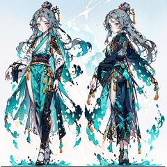 ((grey_hair, blue_eyes, hair_ornament, centre parting bangs, )),(full_body(front_view, back_view),uper_body(front_view, left_view, right_view)),(((white background, simple background:1.2))),(dynamic_pose:1.2),(CharacterSheet:1.2),ku hua, fu hua/fushengxianren, grey_hair, blue_eyes, hair_ornament, centre parting bangs, ponytail, taoist robes, chinese_clothes,fu hua/fushengxianren