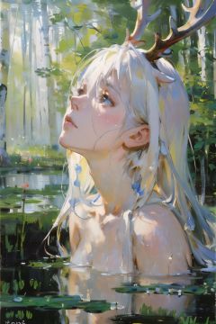 1girl,birch forest,monet color,(antler:1.2),naked,stream,close shot,huge chest,close shot,anime characters,white hair,deer hair,the whole body,oil painting,post-impressionist,(face upward:1.2),Post Impressionist,Droplets,well,soft lighting,COOL,