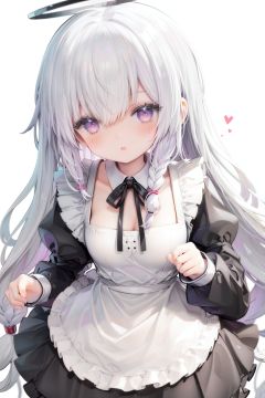 1girl, solo, apron, long hair, hair over one eye, white background, frills, braid, halo, long sleeves, dress, simple background, white hair, white apron, puffy sleeves, very long hair, frilled apron, maid, purple eyes, ribbon, parted lips, maid apron, bangs, juliet sleeves, black dress, neck ribbon, looking at viewer, single braid, blush