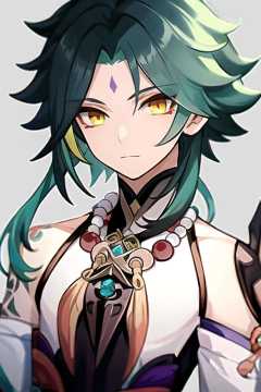 masterpiece, best quality, ultra detailed,illustration, detailed light, <lora:Genshin_Xiao_AP:0.8>,1boy, shota, solo, (multicolored hair:0.6), dark green hair, messy short hair, yellow eyes, (forehead mark:0.7), (arm tattoo:0.7), (white clothes), xiao \(genshin impact\), jewelry, bead necklace, necklace, simple background, upper body, looking at viewer