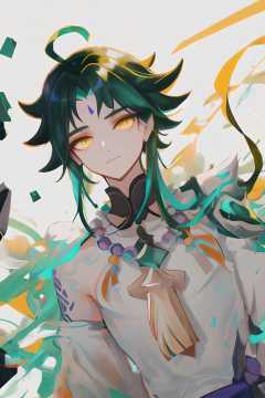 masterpiece, best quality,solo,1boy, <lora:xiao:0.7>,xiao_\(genshin_impact\), arm_tattoo, male_focus, 1boy, green_hair, forehead_mark, yellow_eyes, facial_mark, grey_background, body_markings, bead_necklace, chest_tattoo, jewelry, (dynamic angle:1.3)
