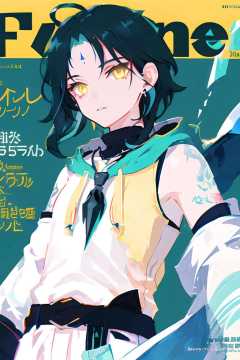 masterpiece, best quality, ultra detailed,illustration, detailed light, (dynamic angle), detailed eyes, ((magazine cover)), <lora:Genshin_Xiao_AP:0.8>,((1boy)), solo, flat chest, (multicolored hair:0.7), dark green hair, messy short hair, yellow eyes, (forehead mark:0.7), forehead, ahoge, necklace, arm tattoo, detached sleeves, hooded coat, (buckle), bumbag,earrings,belt,((fashion)), street style, (waist), color contrast, simple background,upper body, looking at viewer,glowing eyes, light particles,