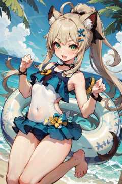 masterpiece, best quality, <lora:Genshin_Kirara_AP_v1:0.6:LESS>, 1girl, head, green eyes, animal ears, ahoge, (long straight hair:1.2), ponytail, hair ornament, bare shoulders, small breasts, navel, bare arms, barefoot, (two tails:1.1),happy, open mouth, fang, blush, (white swimsuit:1.3), frills, (white bikini:1.1), ribbon, beach,