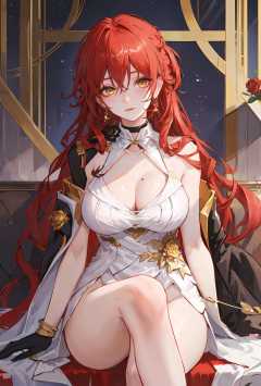 masterpiece, best quality, <lora:StarRail_Himeko_AP_v1:0.65:LESS>,1girl, head, official,yellow eyes, red hair, long hair, large breasts, (mole:0.8),single earring, white dress, black jacket, (golden rose on neck:1.1), black gloves, thighs,starry sky, (sitting:1.1),from below, looking at viewer, arm support, arm at side,