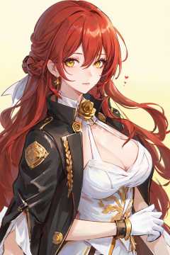 masterpiece, best quality, 1girl, head, official, <lora:StarRail_Himeko_AP_v1:0.7:LESS>,yellow eyes, red hair, white dress, black gloves, long hair, black jacket, golden rose on neck, (mole on breast:0.8), yellow background, simple background, upper body,