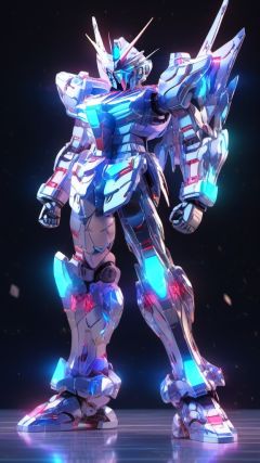Gundam, solo, blue_eyes, standing, no_humans, glowing, robot, mecha, glowing_eyes, clenched_hands, science_fiction, looking_ahead, v-fin,photo,8k,intricate,highly detailed,majestic,digital photography,broken glass,(masterpiece, sidelighting, finely detailed beautiful eyes:1.2),hdr,realistic,high definition,<lora:SDXL_gundam_Transparent:0.7>,