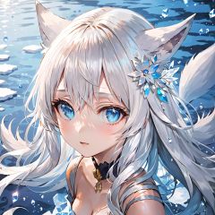 masterpiece, best quality,official art, extremelydetailed cg 8k wallpaper,(flying petals)(detailed ice) , crystalstexture skin, coldexpression, ((fox ears)),white hair, longhair, messy hair, blue eye,looking at viewer,extremely delicate andbeautiful, water, ((beautydetailed eye)), highlydetailed, cinematiclighting, ((beautiful face),fine water surface, (originalfigure painting), ultra-detailed, incrediblydetailed, (an extremelydelicate and beautiful),beautiful detailed eyes,(best quality),mooooko