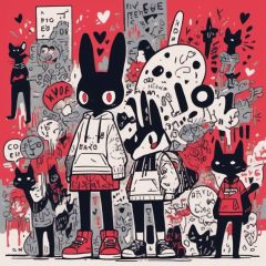 1girl, red eyes, red background, hood, backpack, cat, red hoodie, drawstring, black hair, shoes, hood down, hoodie, long sleeves, solo, bag, holding, hair ornament, english text, socks, earrings, white footwear, bangs, looking at viewer, jewelry, sneakers, phone, standing, blush, full body, skirt, medium hair, black socks, hairclip, red theme, speech bubble, holding phone, closed mouth, cellphone, sleeves past wrists, animal, short hair, simple background, black skirt, romaji text,