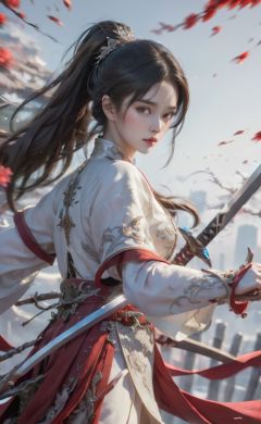 jianjue,wanjianguizong,16k,masterpiece,textured skin,multiple swords,embellished costume,Award winning photos, extremely detailed, stunning, intricate details, absurd, highly detailed woman, extremely detailed eyes and face, dazzling red eyes, detailed clothing,(hands hidden in sleeves:1.3), <lora:EMS-25400-EMS:0.7>, <lora:EMS-15791-EMS:0.3>, <lora:EMS-21302-EMS:0.3>