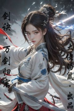 jianjue,wanjianguizong,16k,masterpiece,textured skin,multiple swords,embellished costume,Award winning photos, extremely detailed, stunning, intricate details, absurd, highly detailed woman, extremely detailed eyes and face, dazzling red eyes, detailed clothing,(detailed clothing, tightly holding sword in hand:1.5)