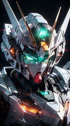 Gundam,solo,looking_at_viewer,green_eyes,no_humans,glowing,robot,portrait,mecha,glowing_eyes,science_fiction,straight-on,v-fin,mobile_suit,cinematic lighting,strong contrast,high level of detail,Best quality,masterpiece,White background,<lora:gundam_Transparent:0.7>,
