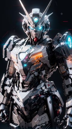 Gundam, solo, looking_at_viewer, blue_eyes, standing, no_humans, glowing, robot, mecha, glowing_eyes, clenched_hands, science_fiction, straight-on, v-fin, mobile_suit,cinematic lighting,strong contrast,high level of detail,Best quality,masterpiece,White background,<lora:gundam_Transparent:0.7>,