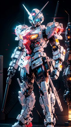 Gundam, solo, looking_at_viewer, blue_eyes, standing, no_humans, glowing, robot, mecha, glowing_eyes, clenched_hands, science_fiction, straight-on, v-fin, mobile_suit,cinematic lighting,strong contrast,high level of detail,Best quality,masterpiece,White background,<lora:gundam_Transparent:0.7>,