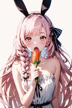 (masterpiece:1.2), best quality,pixiv,1girl, solo, animal ears, carrot, rabbit ears, pink hair, braid, white background, long hair, simple background, bare shoulders, mouth hold, food in mouth, upper body, bangs, strapless, ribbon, brown eyes, tongue, hair ribbon, blush, food, white dress, dress, open mouth <lora:midjourney:1>