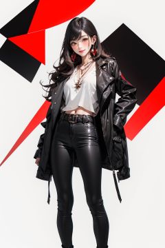 (masterpiece:1.2), best quality,CG,midjourney,1girl, jewelry, solo, long hair, leather, black hair, ring, leather jacket, earrings, jacket, white background, looking at viewer, simple background, black jacket, pants, brown eyes, breasts, bangs, piercing, black pants, long sleeves, belt, cowboy shot, leather pants, closed mouth, ear piercing, zipper, blush, cropped jacket, necklace, shirt, smile <lora:midjourney:1>