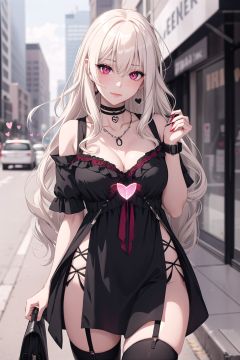 breasts, 1girl, thighhighs,swf,long hair, garter straps, jewelry, cleavage, (RED eyes), (small breasts), looking at viewer, black choker, outdoors, necklace, shirt, bag, choker, (platinum blonde hair), (absurdly long hair:1.4),(curly_hair:1.2),( crossed bangs:1.2),short sleeves, (revealing dress:1.5), (heart-shaped pupils:1.5), collarbone, smile, covered navel, cowboy shot, bangs, black thighhighs, holding, thigh gap, closed mouth, skindentation, holding bag, solo, thighs, street, city, taut clothes, solo focus, day, road, blush, zettai ryouiki, standing, building, hand up, hair between eyes, black dress, masterpiece, best quality,