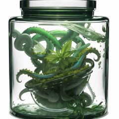(Masterpiece, best_quality, CG ), white background,[(a huge empty glass container in jar shape) : (a huge empty glass container in jar shape with white mucus inside):0.35]( green tentacles in glass container : 1.3 ) , ( herb-medicines and plant in glass container : 1.0 )(no humans :1.1),, masterpiece, best quality,