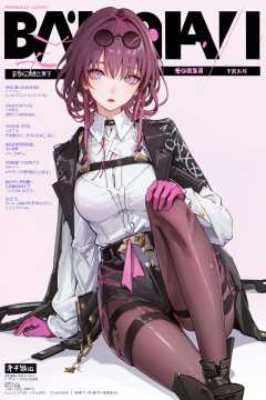masterpiece, best quality, 1girl, <lora:StarRail_Kafka_AP_v1:0.9:LESS>,official, purple eyes, (empty eyes:1.2), eyewear on head,black jacket, jacket on shoulders, shirt,shorts, pantyhose, boots, (magazine cover:1.2), simple background, pink background, purple background,