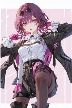 masterpiece, best quality, 1girl, <lora:StarRail_Kafka_AP_v1:0.85:LESS>, official, purple eyes, (empty eyes:1.2), eyewear on head, black jacket, jacket on shoulders, shirt, medium breasts, shorts, pantyhose, boots, single knee boot, (from below:1.1),simple background, pink background, purple background,