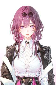 masterpiece, best quality, 1girl, <lora:StarRail_Kafka_AP_v1:0.85:LESS>, official, purple eyes, (empty eyes:1.2), eyewear on head, earring,shirt, black jacket, jacket on shoulders, medium breasts, arms at sides, upper body, looking at viewer, simple background, pink background, purple background,