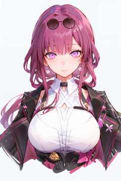masterpiece, best quality, 1girl, official, purple eyes,  <lora:StarRail_Kafka_AP_v4:0.95>,simple background, pink and purple background, white background, purple theme,