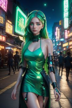 official art, unity 8k wallpaper, (ultra detailed), beautiful and aesthetic, beautiful, masterpiece, best quality, (1girl:1.3), (long hair,green hair:1.4), cyberpunk, mechanical_arms , sexy, iridescent eyes, starry sky, standing, futurecamisole,street, neon light, full_body