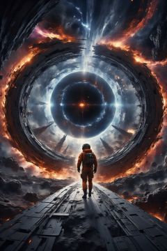 ((masterpiece)), ((best quality)), 8k, high detailed, ultra-detailed,(a person) traveling through a black hole, (time and space) intertwining, (cinematic lighting), (wide-angle lens), high octane, HD, (movie poster style).