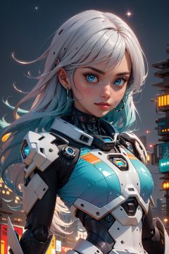 best quality,extremely detailed,detailed background,anime,a young beautiful girl,very long rainbow hair,(close shot),extremely detailed face,an extremely delicate and beautiful mecha girl,extremely detailed eyes,(floating silver grey hair),(Iridescence and rainbow hair),(gradient color mecha clothes),(black and blue and purple mecha clothes),Iridescence and rainbow mecha,(bodysuit:0.8),(cyberpunk),((scifi)),((sci-fi)),night,space,horizon,beautiful detailed starry sky,top of the city,(dynamic posture),solo focus,close up,depth of field,bokeh,cinematic lighting,atmospheric lighting,science fiction,close up shot,close-up photo,(close to the camera),close to the lens,(close to the viewer)