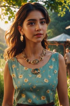 masterpiece, best quality, realistic, 8k, official art, cinematic light, ultra high res, 1girl,  standing, day, sunlight, light on face, earrings , jewelry , necklace , waitress, Nature reserve, hair light