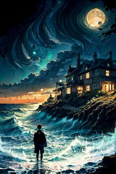 (masterpiece, best quality:1.5)<lora:EpicArt-000008:0.7>, EpicArt, solo, short_hair, 1boy, standing, male_focus, outdoors, sky, cloud, water, from_behind, tree, night, ocean, moon, star_(sky), night_sky, scenery, full_moon, starry_sky, horizon, facing_away, house,