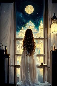 <lora:EpicArt-000008:0.8>, EpicArt, 1girl, solo, long_hair, brown_hair, dress, standing, sky, artist_name, indoors, from_behind, white_dress, window, night, moon, night_sky, scenery, lamp,