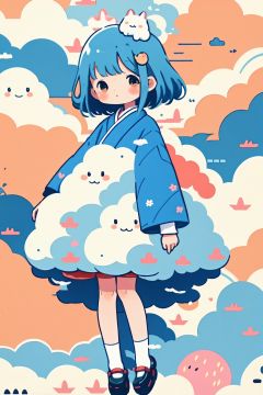 style of Chiho Aoshima, adorable, cute, a girl, royal blue hair, puffy dress, flying donuts, full body, warm colors, simple white background, in clouds, Illustration, cover art, japan, blur, shiny,minimalistic,simplecats