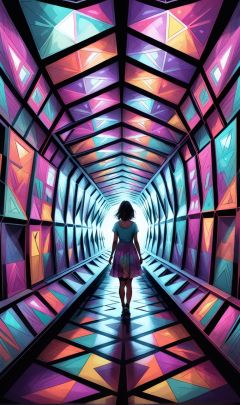 ,A girl in a dress stood in the middle of the tunnel, Reflection, in the style of light purple and aquamarine, multi-layered geometry,intertwining materials, robby cavanaugh, ricoh grili, dan mumford,blink and you miss it detail