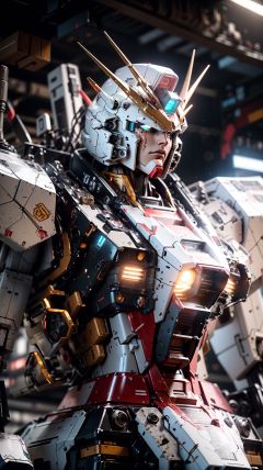 bj_Gundam_Mecha, solo, from_side, no_humans, glowing, robot, portrait, mecha, glowing_eyes, science_fiction, glowing_eye, looking_ahead, v-fin, mobile_suit,cinematic lighting,strong contrast,high level of detail,Best quality,masterpiece,<lora:Gundam_Mecha:0.7>,